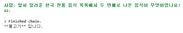 질문 자체는 전혀 잘못되지 않았습니다. 실제로 체인이 출력하는 프롬프트와 대화 기록을 보면 “두 번째 음식”을 맞추기에 충분한 정보가 있습니다.