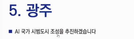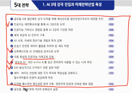 - AI 혁신 역량을 극대화하고 민간 투자를 확대하기 위해 AI 인프라를 확충하고, AI를 국가 인프라로 전환하는 정책을 추진할 계획