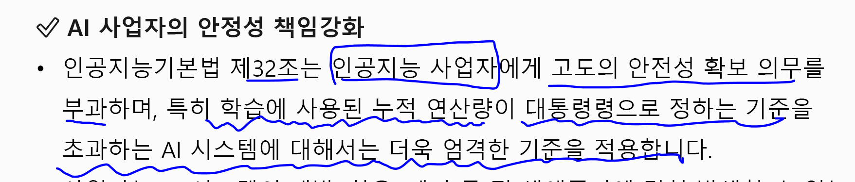 - 인공지능 사업자에게 고도의 안전성 확보 의무 부과(인공지능기본법 제32조)