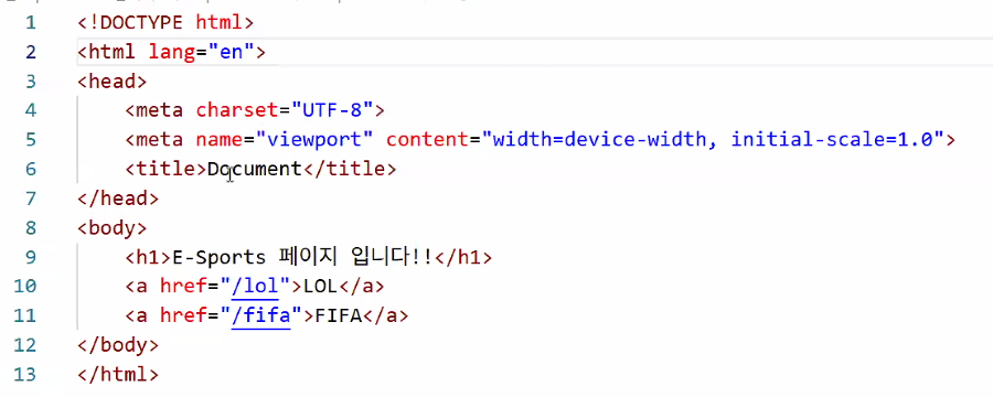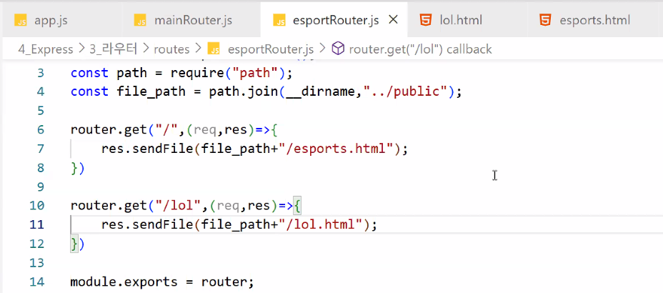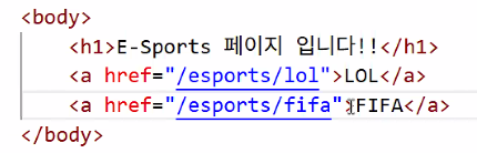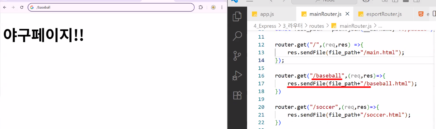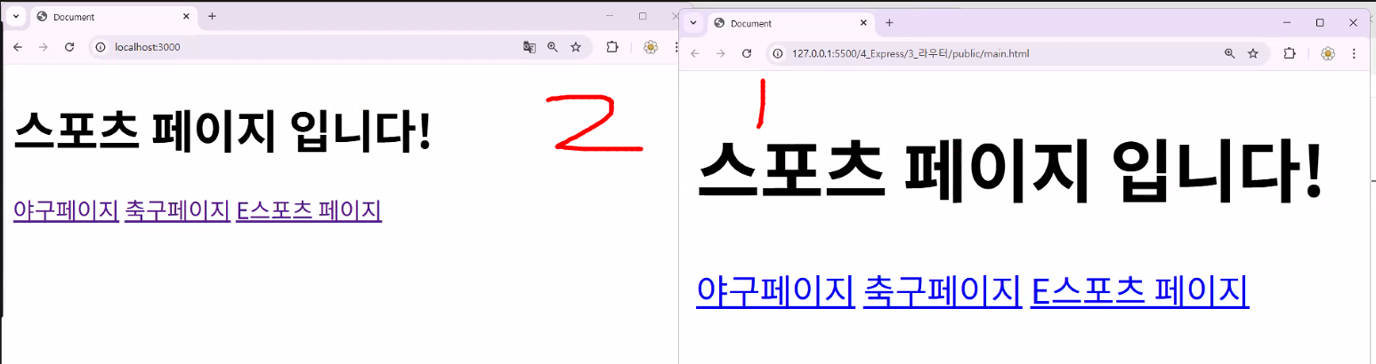 http://localhost:3000 → 뒤에 아무것도 없음)app.use("/",mainRouter);) → 메인 라우터 호출router.get("/",(req,res)=>{res.sendFile(filePath+"/main.html");}); 실행 → main.html 보여주기http://localhost:3000/baseball)app.use("/",mainRouter);) → 메인 라우터 호출router.get("/baseball",(req,res)=>{res.sendFile(filePath+"/baseball.html");}); 실행 → baseball.html 보여주기http://localhost:3000/esports)app.use("/esports",esportsRouter);router.get("/",(req,res)=>{res.sendFile(filePath+"/esports.html");}); 실행 → esports.html 보여주기http://localhost:3000/esports/lol)app.use("/esports",esportsRouter);router.get("/lol",(req,res)=>{res.sendFile(filePath+"/lol.html");}); 실행 → lol.html 보여주기이제 '회원 가입, 탈퇴, 수정, 삭제' 구현을 위해 데이터베이스를 배워봅시다!