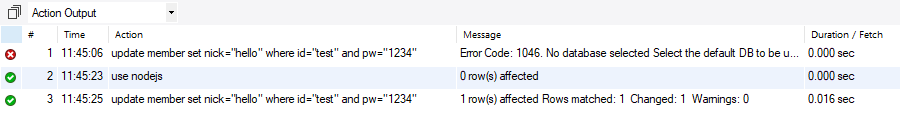 update member set nick="hello" where id="test" and pw="1234";use 명령어 먼저 쓰기 (안 그러면 오류남)