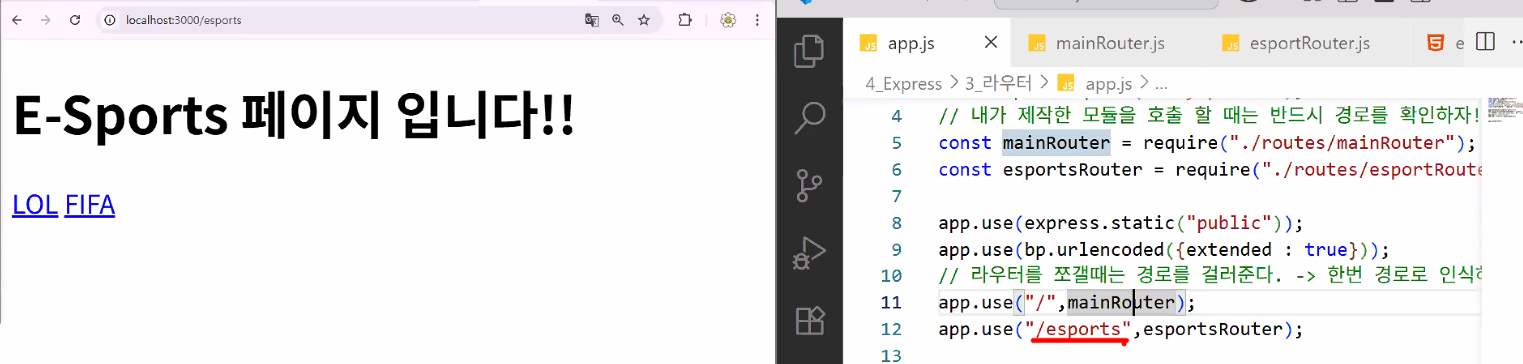 // esportsRouter는 app.js에서 한번 경로를 걸러서 들어온다 → /esports 경로가 사라진다.