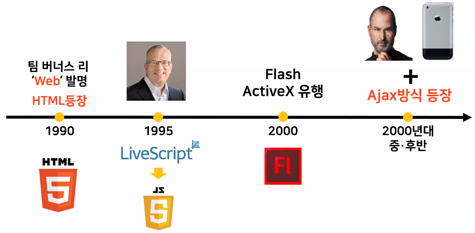 - 플래시와 액티브X → 웹 페이지에 다양한 기능 호출 → 어떤 사이트에 들어가든지 막 설치하다 보니까 점점 느려지기 시작함 → 스티브 잡스의 선언: 플래시와 액티브X 안 쓰겠다(아이폰 일체형 배터리 문제) → node.js
