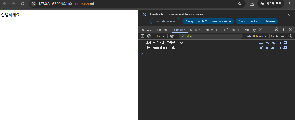 console.log() → 개발자 도구의 콘솔창에 출력하는 방법