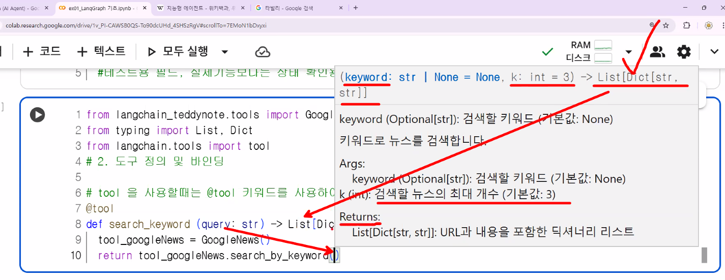 - 인공지능 에이전트 워크플로우에서 ‘사용자 정의 함수’를 툴로 등록할 때 내부적으로 LangChain/LangGraph가 Tool Registry에 올바른 명세(name, args, description 등)를 남기기 위해 데코레이터(@tool 등)가 필요