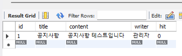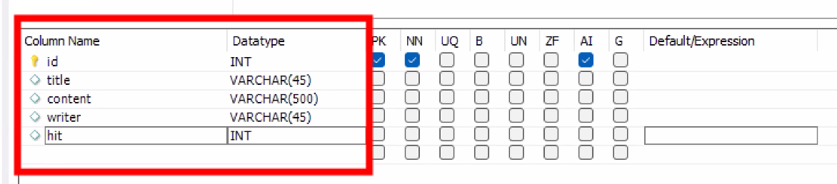 - 컬럼 생성: id, title, content, writer, hit