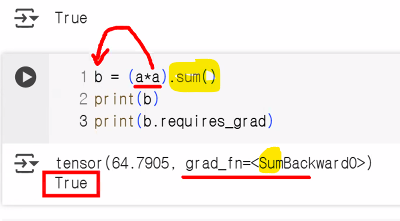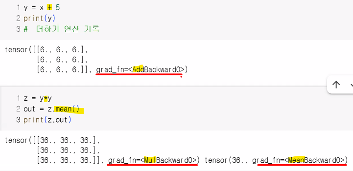 requireds_grad_(): True 지정 시 해당 텐서에서 이루어지는 모든 연산들을 추척, 기록하기 시작backward(): 추적 기록을 따라 역방향으로 자동 미분을 수행하고 계산된 기울기를 반영 (→ 오차역전파)# requires_grad_(): 인플레이스 연산(_) → 연산 후 기존 텐서에 값을 덮어씌워 저장하는 연산
