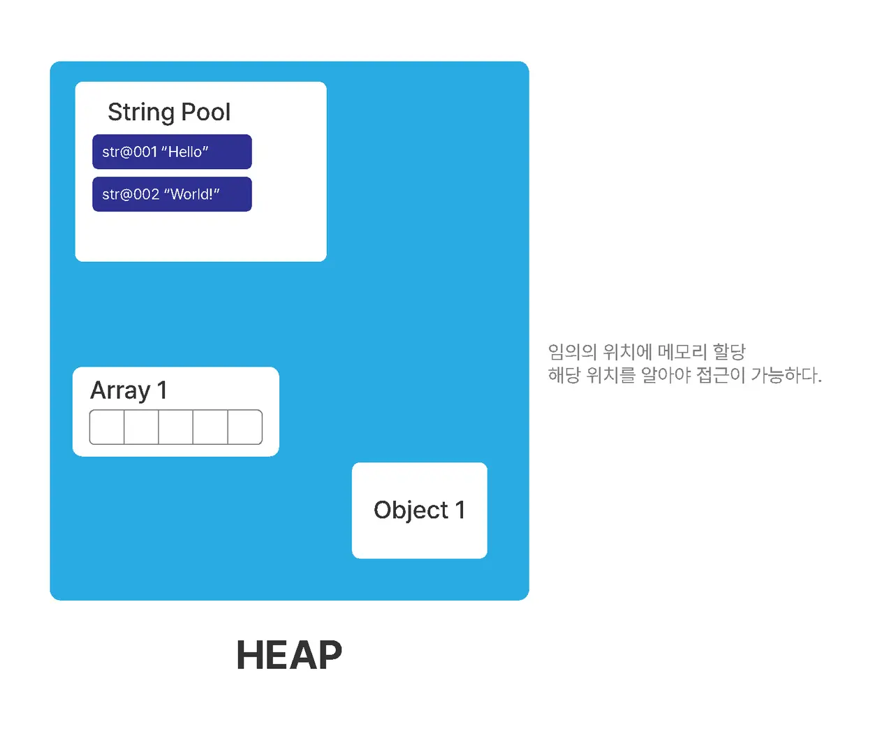 - 하지만 힙의 경우 순서가 없어 힙 영역 내의 데이터를 확인하려면 해당 값이 어디에 있는지 확인해야 함 == 힙 영역 내의 주소(위치)를 알아야 함