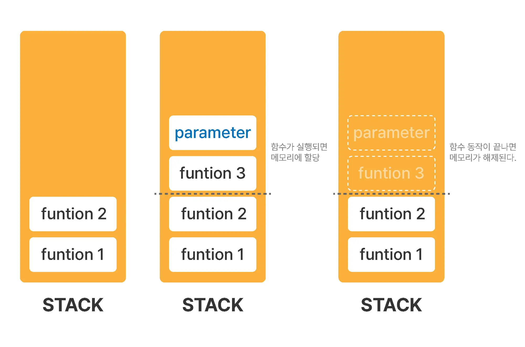 - 즉, 함수를 호출하면 해당 함수와 관련된 것들이 스택 메모리에 차곡차곡 로드되고 함수의 동작이 끝나면 해당 함수가 사용하던 메모리가 해제됨