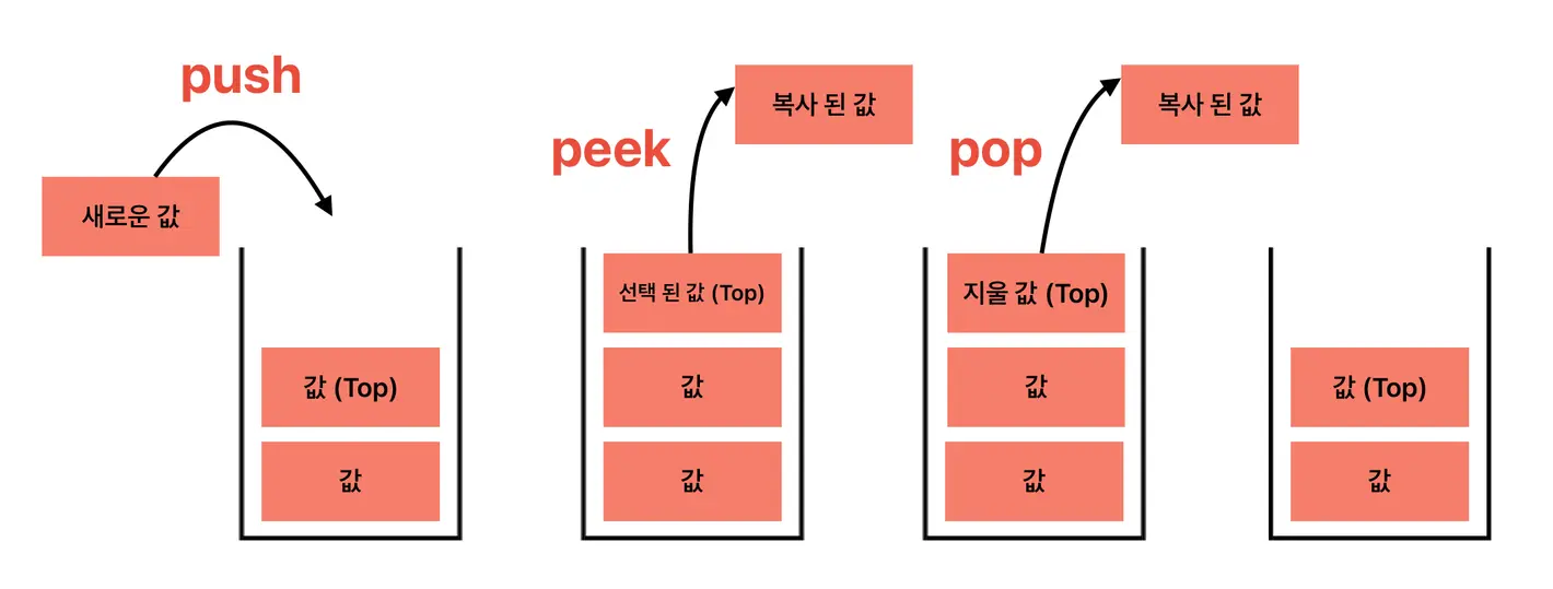 - 스택의 한쪽 끝에서만 데이터의 삽입과 삭제가 이루어짐