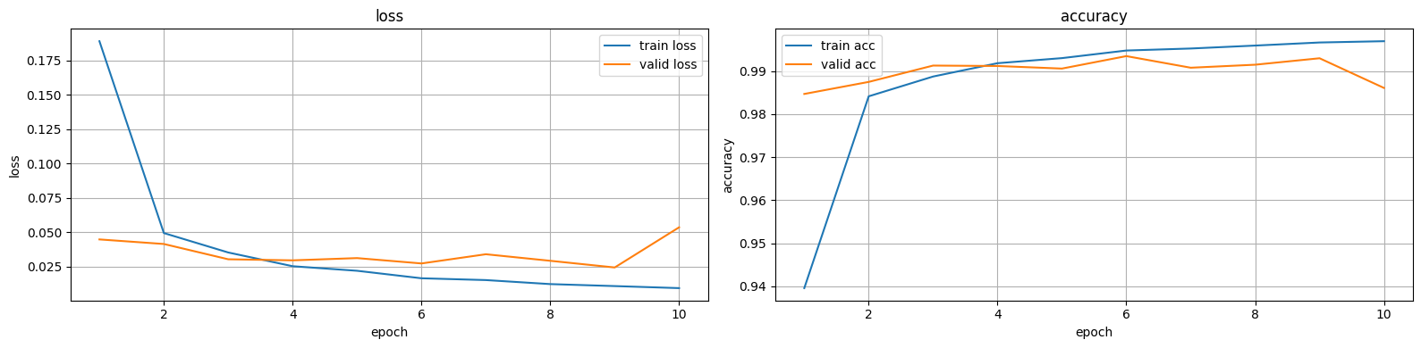 100%|██████████| 10/10 [02:02<00:00, 12.28s/it]epoch10 acc:0.9970 loss:0.0093 val_acc:0.9861 val_loss:0.0536 lowest_loss:0.0243