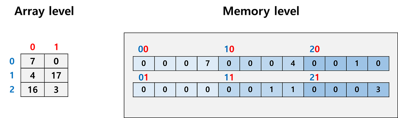 첫 번째 방법이든 두 번째 방법이든 우리가 코드 레벨에서 다루는 array는 전혀 변하지 않았지만(똑같은 index를 사용하면 똑같은 값을 얻을 수 있음) 분명 memory level에서는 저장된 순서의 방향이 바뀌었음 → contiguous 개념의 발생