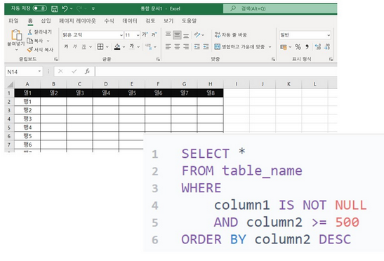 - 따라서 평소 사용하던 엑셀의 기능과 이를 사용하는 맥락, 노하우, 디테일을 바탕으로 SQL 명령어를 익히면 쉽게 이해할 수 있다.