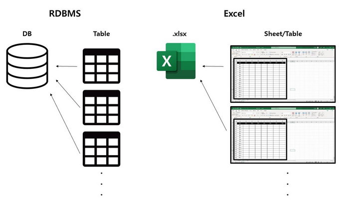 - 엑셀이 제공하는 핵심 기능은 바로 '데이터의 기록과 관리' → RDBMS와 사실상 동일