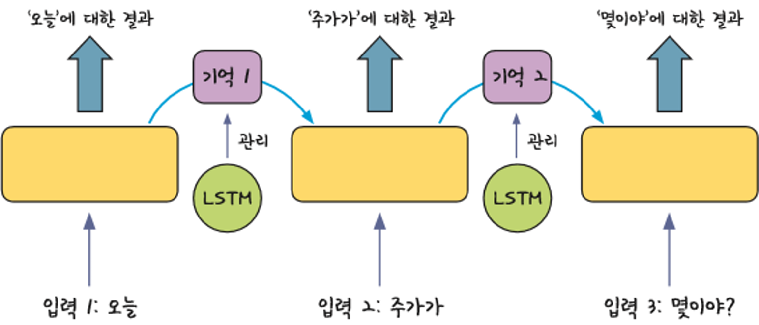 # LSTM 모델 설계 → 내부적으로 연산이 추가된 거라 설계 방식은 기존과 동일함