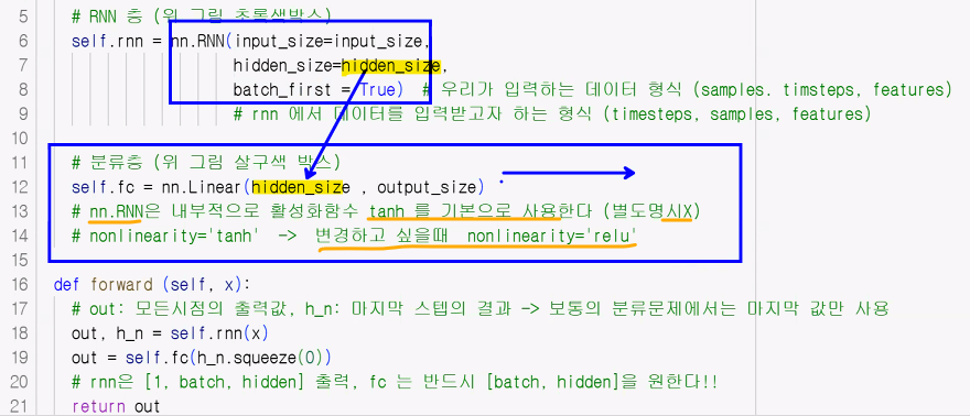 output, h_n = self.rnn(x) # out: 각 time step의 hidden state를 모두 포함(매 시퀀스마다 나오는 값), h_n: 최종 시퀀스의 전체 값(마지막 레이어의 최종 hidden state를 의미)