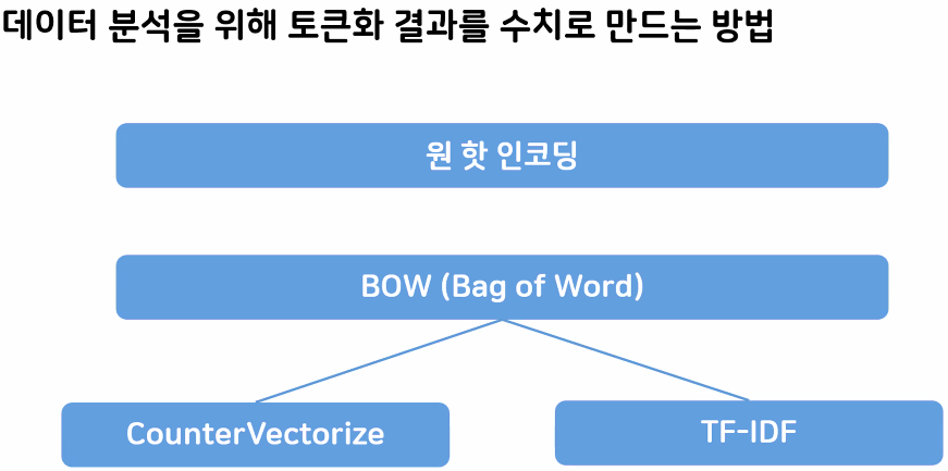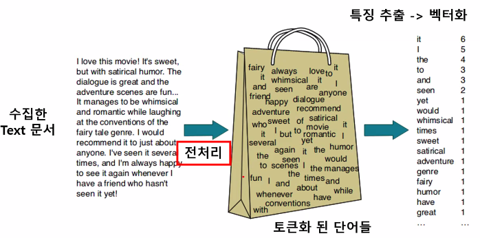 텍스트 데이터를 분석하려면 무조건 "전처리 - 토큰화 - 수치화" 과정 거쳐야 함 (필수)