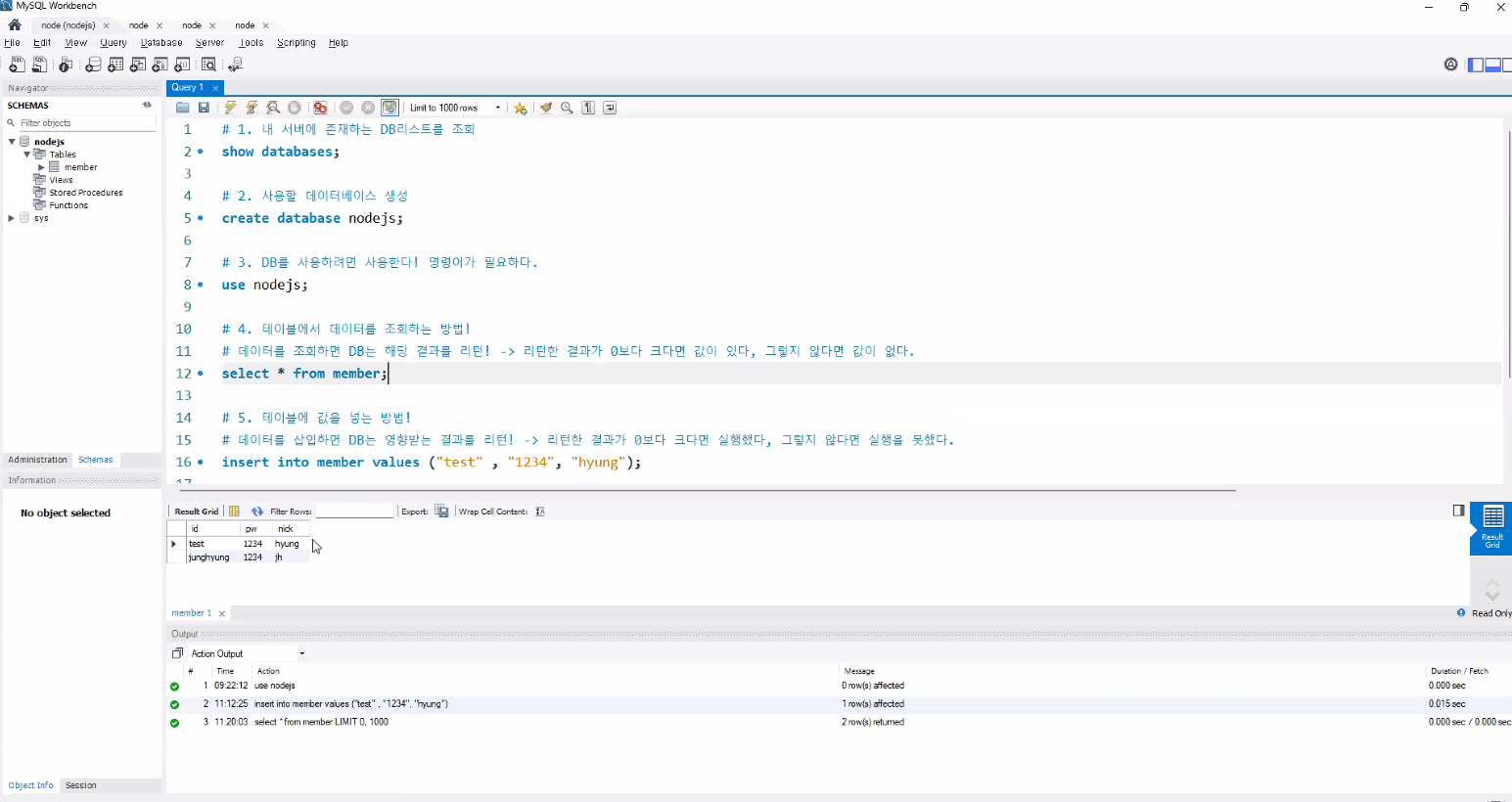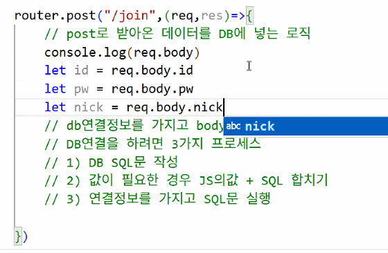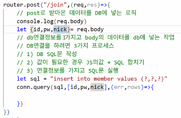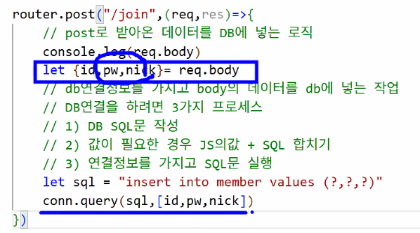 let {id,pw,nick} = req.body;: 이름과 순서가 일치해야 함Destructuring assignment