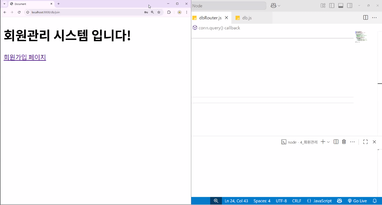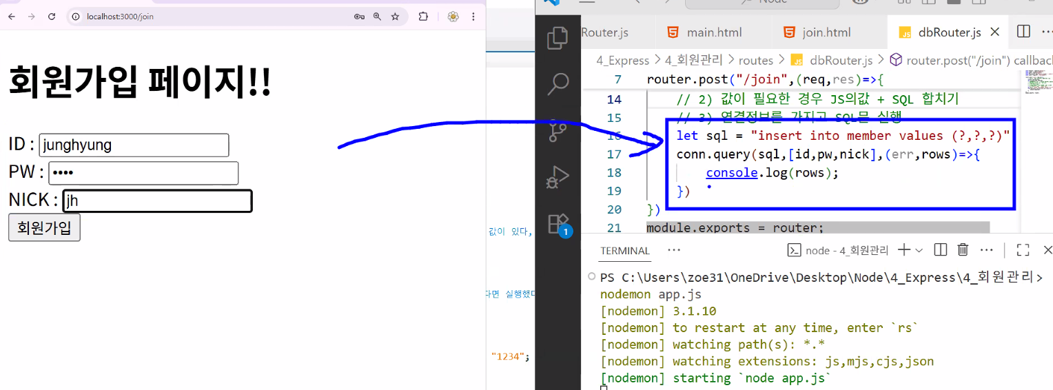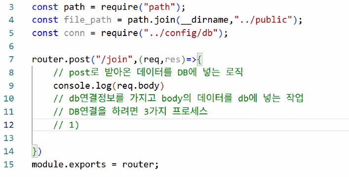 /db 있어요? → 네 → dbRouter.js 실행/db 뒤에 뭐 있어요? → post로 /join 왔어요 → 로직 실행conn.query: db랑 연결되었으면 쿼리문 돌리자 → sql 변수에 들어 있는 쿼리문!(insert)