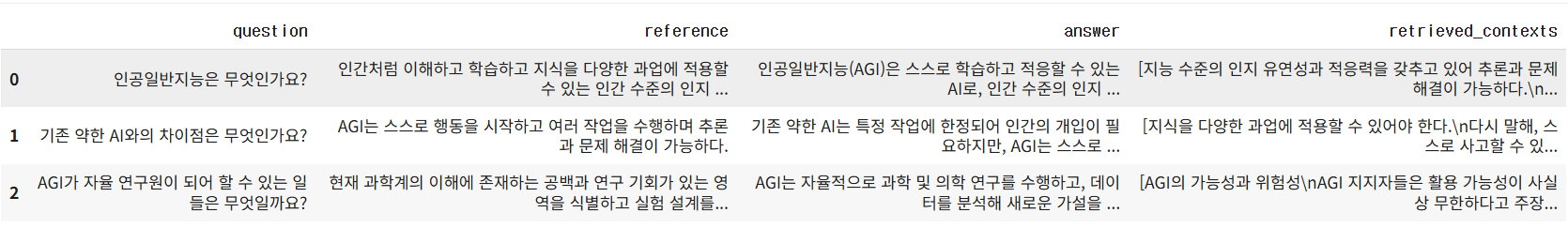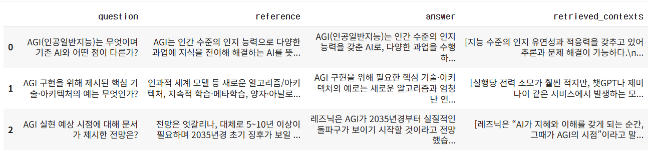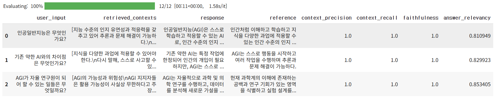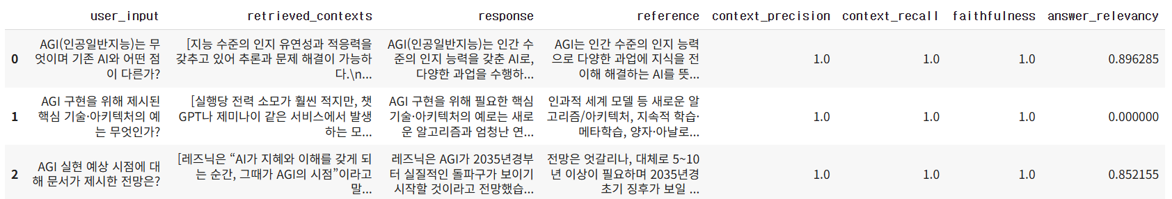 - 이 두 점수가 모두 0인 경우는 입력 데이터(질문, 답변, 참조, 문맥) 간 의미 불일치 또는 포맷 오류 가능성이 크니 데이터 검증이 필요합니다. 또한 RAGAS 평가 도구가 요구하는 정확한 입력 형식을 따르고 있는지 점검하는 것이 좋습니다.