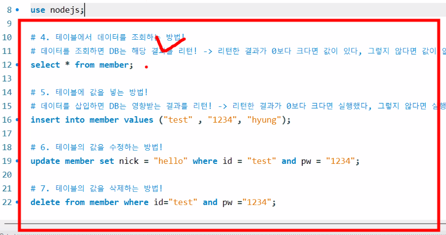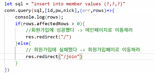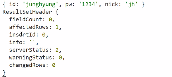 conn.query(sql,[id,pw,nick],);: sql 변수에 있는 쿼리문 쓸 건데 물음표에 [] 안의 변수를 넣어달라는 뜻