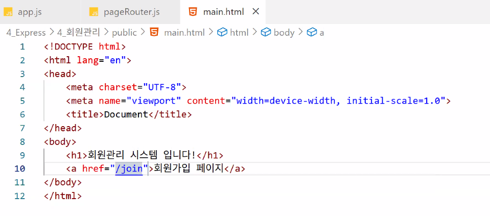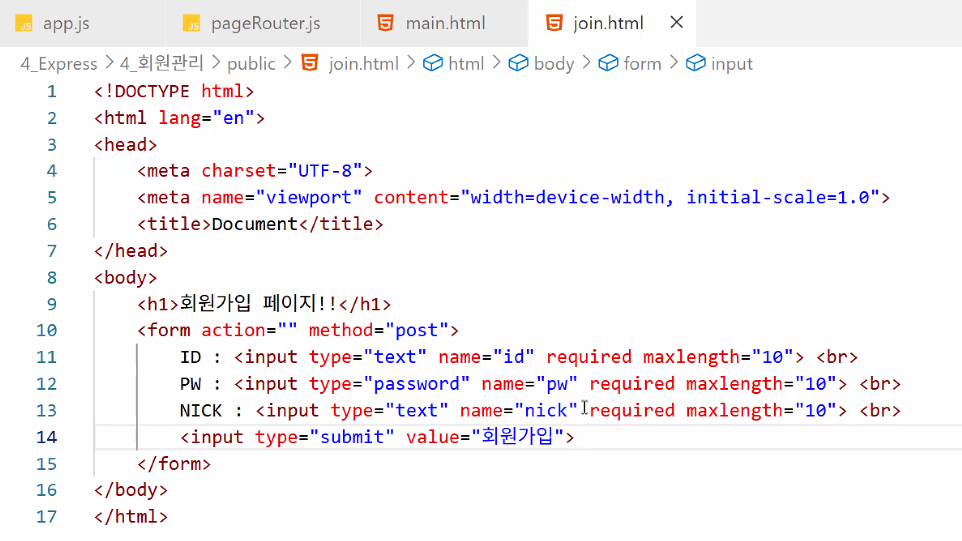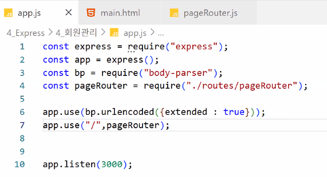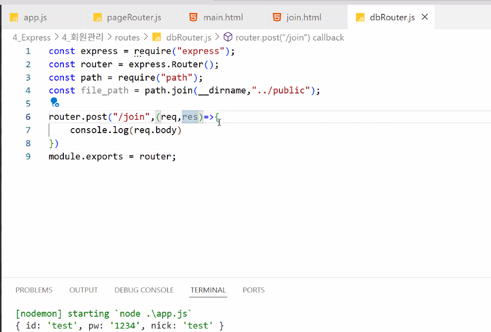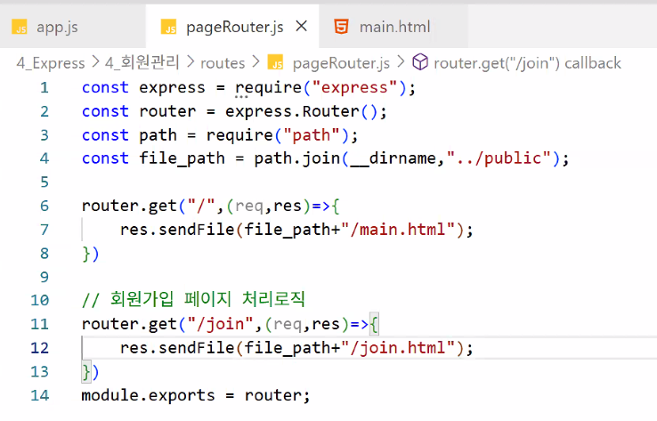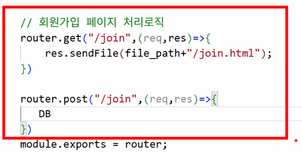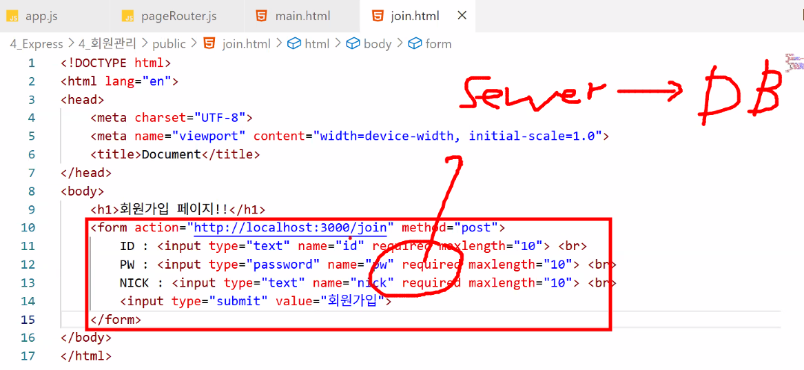 http://localhost:3000 메인 입장/db 있어요? → 없어요 → pageRouter.js 실행:3000 뒤에 뭐 있어요? → 없어요 → main.html 리턴/db 있어요? → 없어요 → pageRouter.js 실행:3000 뒤에 뭐 있어요? → /join 있어요 → join.html 리턴http://localhost:3000/db/join에 post 방식으로 값 전송