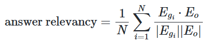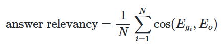 - Answer Relevancy (답변 연관성): 생성된 답변이 원래 질문과 얼마나 관련성이 높은지를 평가하는 지표입니다. LLM이 생성한 답변을 바탕으로 역으로 질문을 여러 번 생성하고, 이 인공 질문들과 원래 질문의 임베딩 코사인 유사도를 평균 내어 계산합니다. 점수가 낮으면 답변이 불완전하거나 불필요한 정보가 포함된 것이고, 높으면 질문에 적절히 답한 것입니다. 이 점수는 보통 0에서 1 사이지만 코사인 유사도 특성상 -1에서 1 사이일 수도 있어 0 또는 1이 아닐 수도 있습니다.