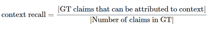 - Context Recall (문맥 재현율): 시스템이 얼마나 많은 관련 정보를 성공적으로 검색해냈는지를 나타내며, 중요한 정보를 놓치지 않는 정도를 평가합니다. 예를 들어 참조 답변(ground truth)을 여러 개의 개별 주장(claim)으로 나눈 뒤, 검색된 문맥(retrieved contexts)이 그 각각을 얼마나 커버하는지 확인하는 방식입니다. 최대 1까지의 값으로 평가되며 0이면 전혀 관련 정보를 못 찾은 것입니다.