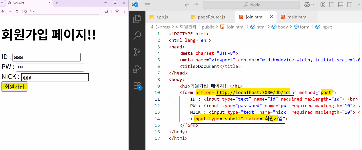 action="http://localhost:3000/join" 입력 → 오류 발생
