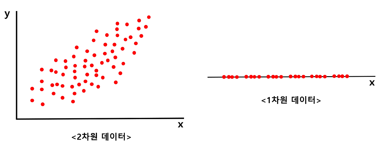 : 아래 [그림 1] 에서 왼쪽에 있는 2차원 데이터를 오른쪽에 있는 1차원 데이터로 최대한 특징을 살리며 차원을 낮춰주는 것