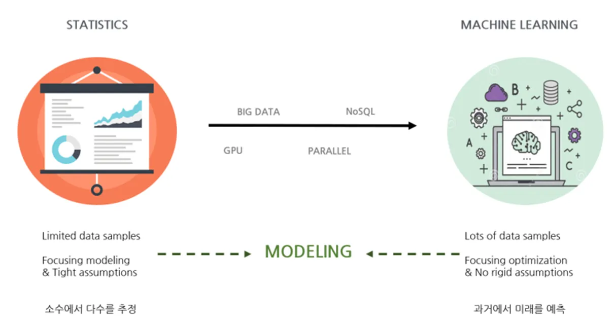→ "통계학에서는 꼭 필요한 '가정' 없이 데이터를 싹 다 모아서 그걸로 패턴을 발견해 보자!"라는 것이 머신 러닝의 기조