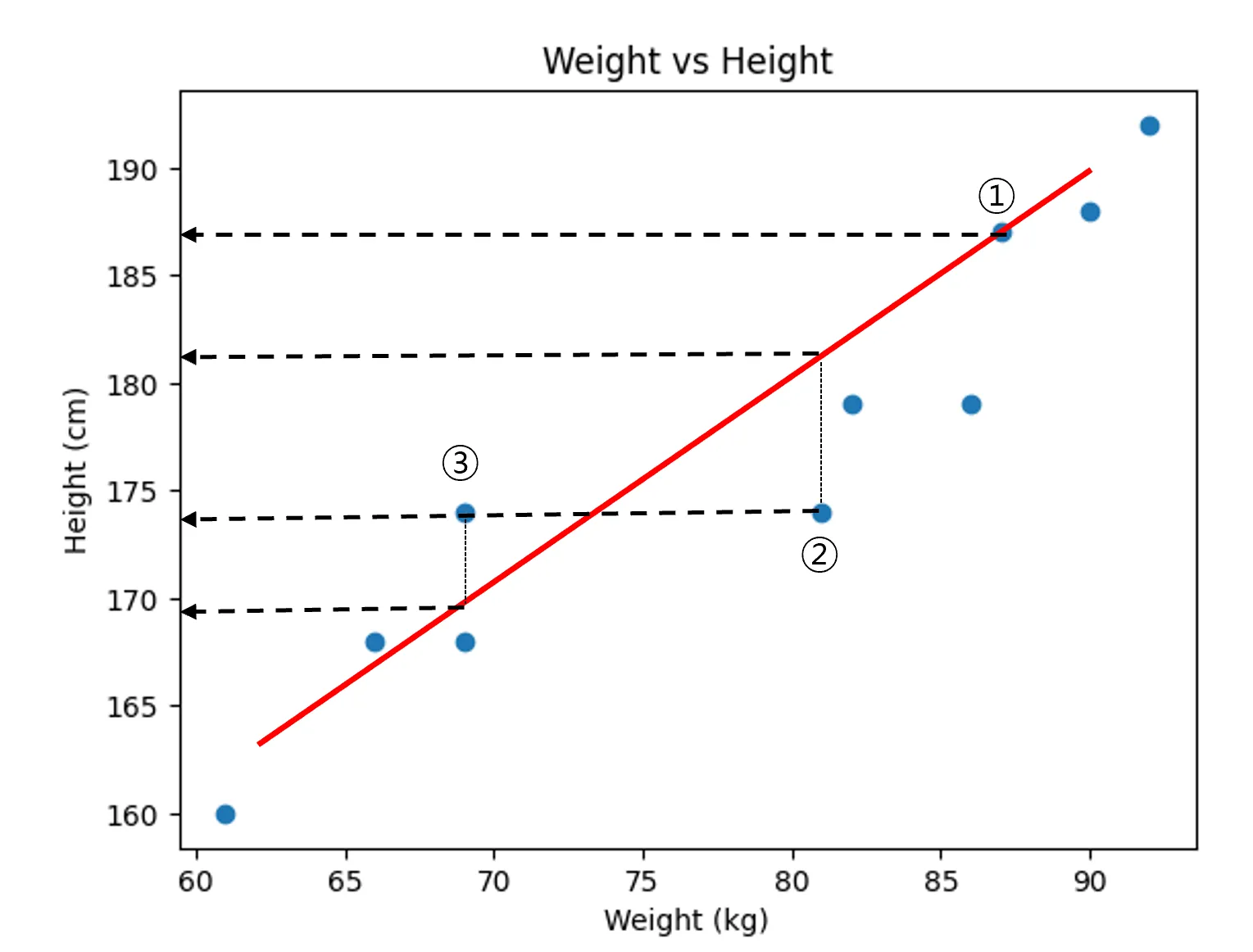 중학교 1학년 때 1차 방정식을 배운 머신이는 키와 몸무게에 대한 데이터가 너무 많아서 무슨 두 점을 이어 직선을 만들지 고민 되었지만, 수 많은 점들을 관통하는 여러 개의 직선을 많이 그려보기로 했다.