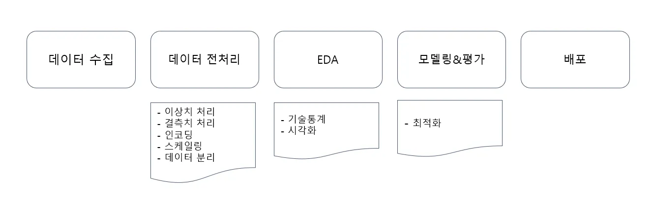 데이터 프로세스는 위와 같아요. 이번 과정에서는 데이터 전처리, 모델링, 평가에 대해서 배울 예정이예요. 또한, 해당 방법론을 적용하기 위한 라이브러리를 연습해볼 예정입니다.