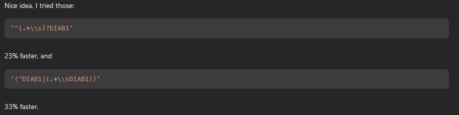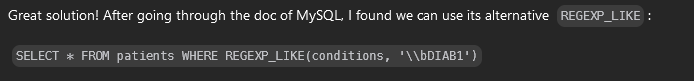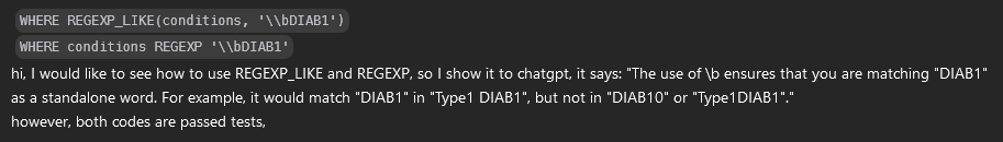 \\bDIAB1is actually the same as conditions LIKE '% DIAB1%' OR conditions LIKE 'DIAB1%';, but it is obviously shorter.