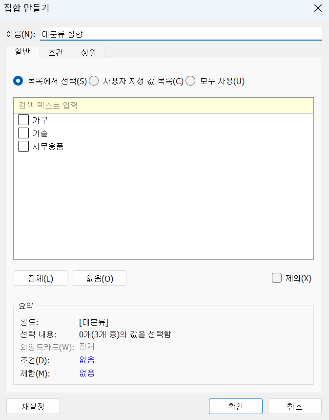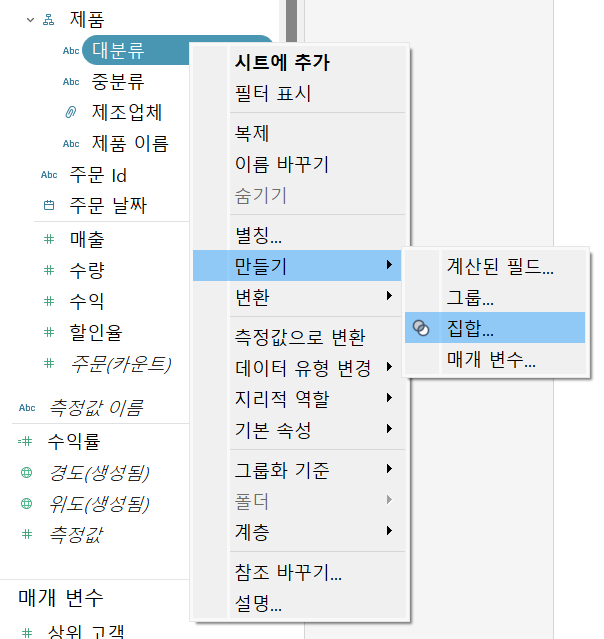 - 왼쪽 데이터 패널 차원의 [대분류] 필드를 마우스 오른쪽 클릭하여 '만들기>집합'을 선택