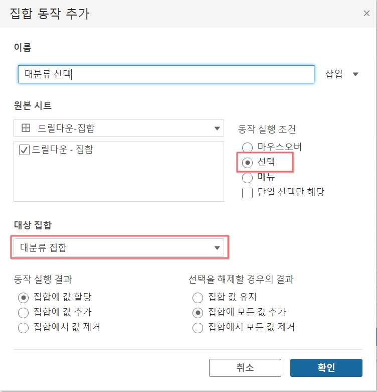 - 대시보드 상단 탭에서 대시보드 > 동작 > 집합 값 변경을 통해 클릭할 때마다 선택된 대분류 집합이 변경되도록 설정