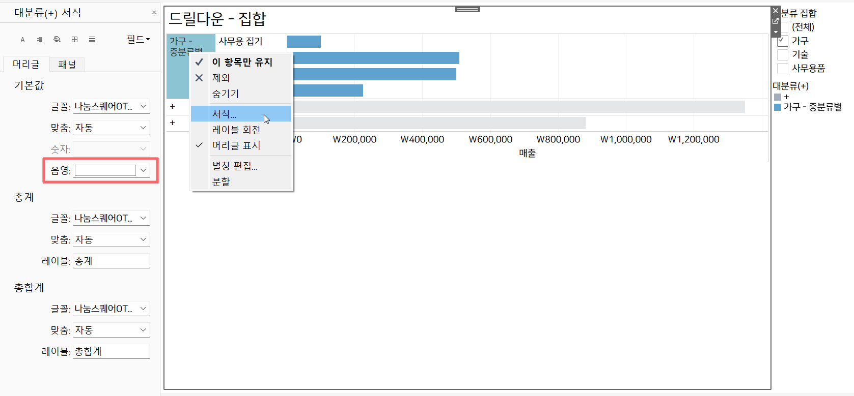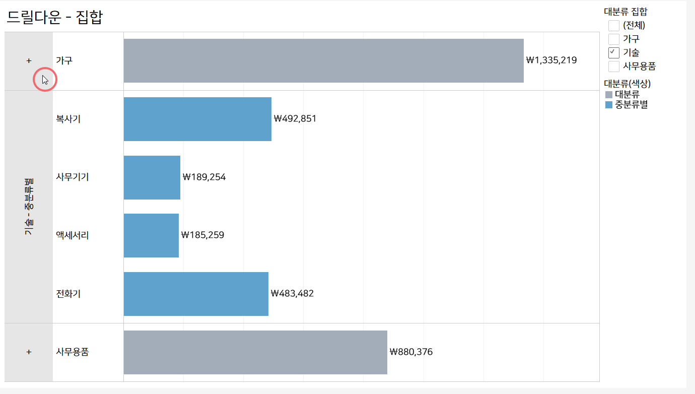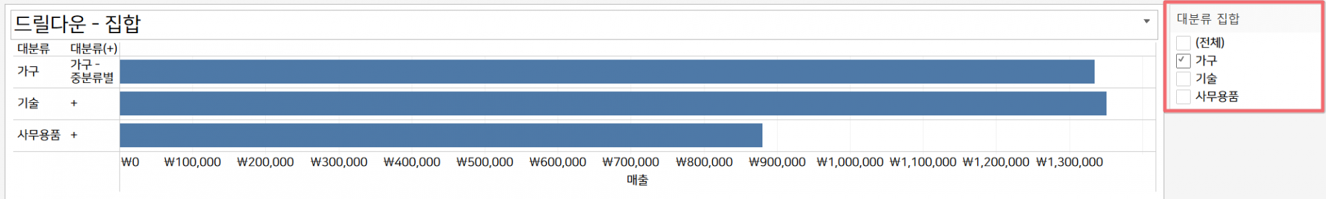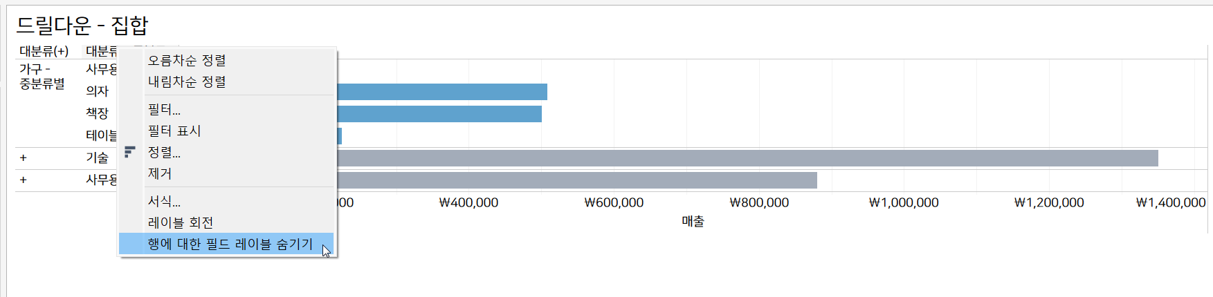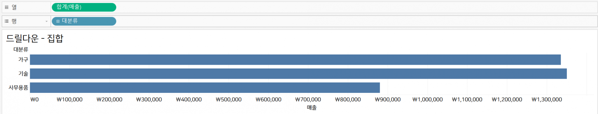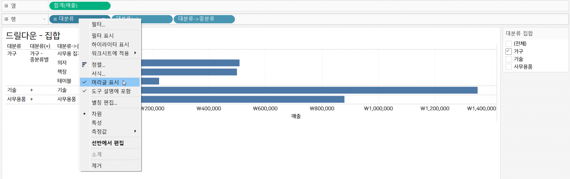 - 행 선반의 맨 오른쪽에 만들어 놓은 계산식을 올려 [대분류 집합]에서 IN인 항목만 중분류 수준으로 드릴다운 되도록 설정