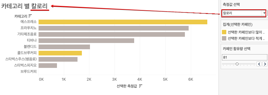 측정값을 칼로리/카페인/당류 선택 가능하도록 하고, 선택한 카페인 함유량에 따라 카테고리 색상이 표시되도록 해 주세요