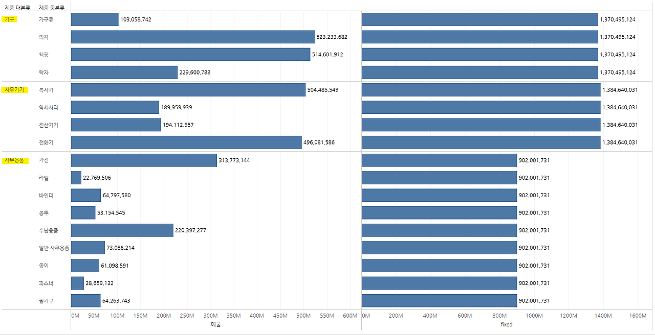 { EXCLUDE [제품 중분류]:SUM([매출])}