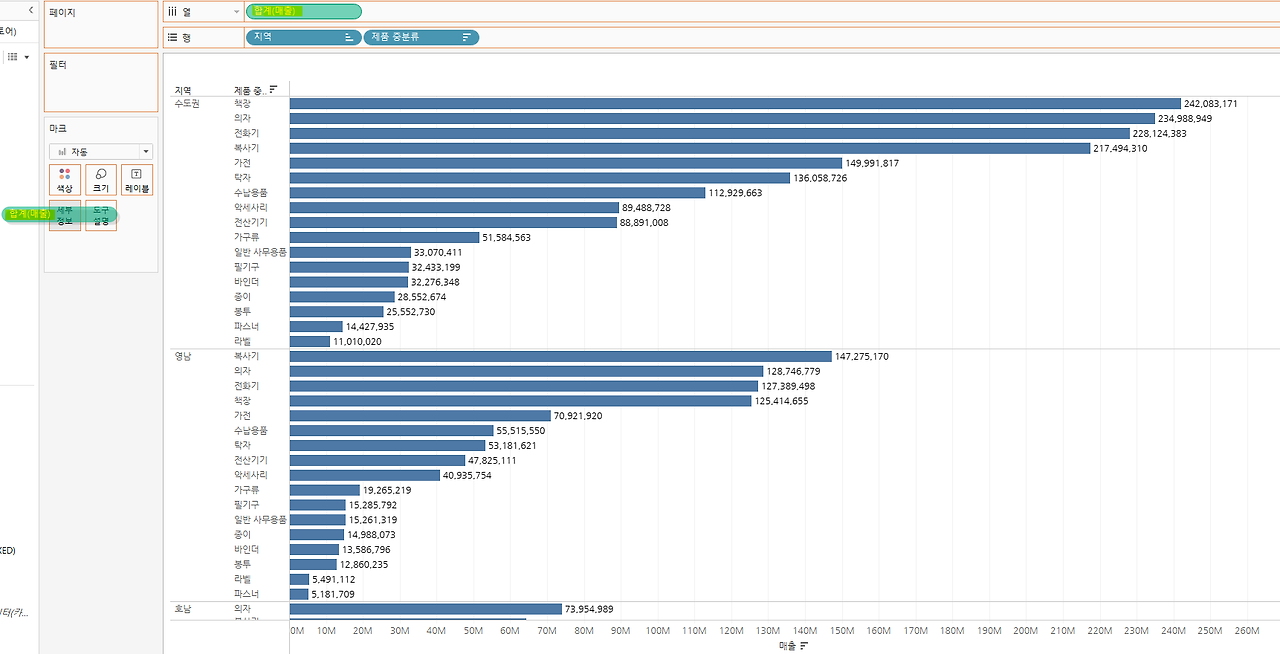 - 위와 같이 지역별 제품 중분류별 매출의 합계 그래프가 있다고 했을 때, \<합계(매출)> 차원을 ctrl을 누른 채로 마크의 '세부 정보'로 이동