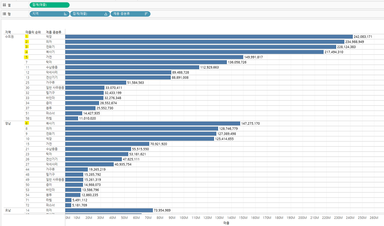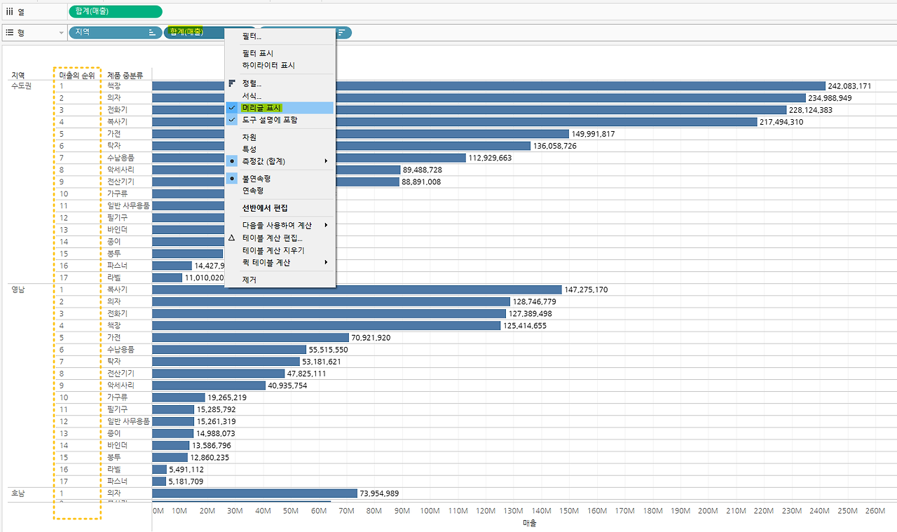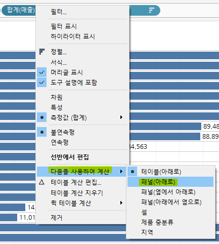 - 지역별로 순위를 보고 싶으면 \<합계(매출)> 필드에서 마우스 우클릭 > 다음을 사용하여 계산 > 패널(아래로)