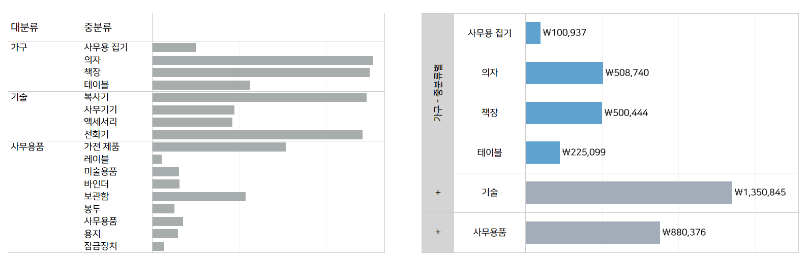 - '대분류>중분류'별 매출을 나타낸 두 막대 차드 중 오른쪽 차트가 눈에 더 잘 들어옴