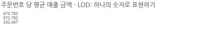 - 주문 번호 당 평균 매출을 구하고 싶은데, 위 사진처럼 <주문 번호> 차원이 화면에 포함되어 있을 때 말고 단순히 숫자 하나로만 표현하고 싶다면