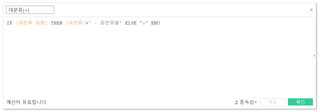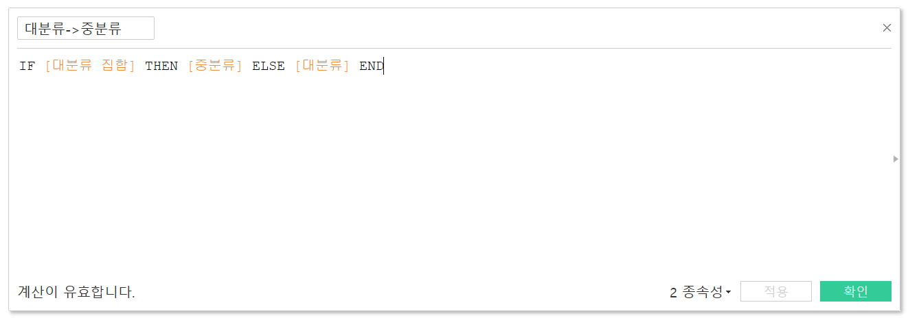 - 즉, [대분류 집합]이 'IN'에 해당하는 경우, [중분류] 수준으로 세분화되어 나타나게 하고, 'OUT'인 경우 [대분류]와 수준이 동일하도록 아래와 같은 계산식을 만들어 주는 것