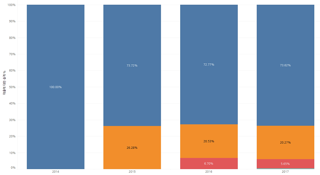 - 해당 그래프를 보면, 2014년에 처음 구매한 고객이 2017년에 73.62% 차지하고 있다는 것을 알 수 있음
