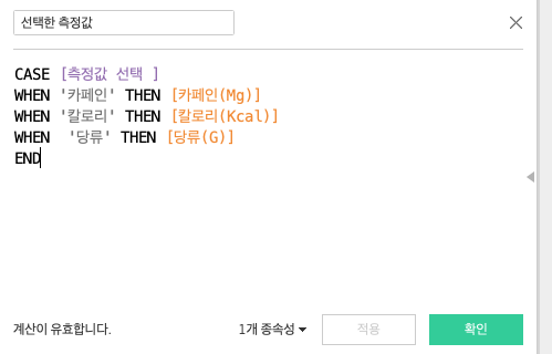 - [측정값 선택] 매개변수에서 선택에 따라 측정값 가져오도록 계산식 작성