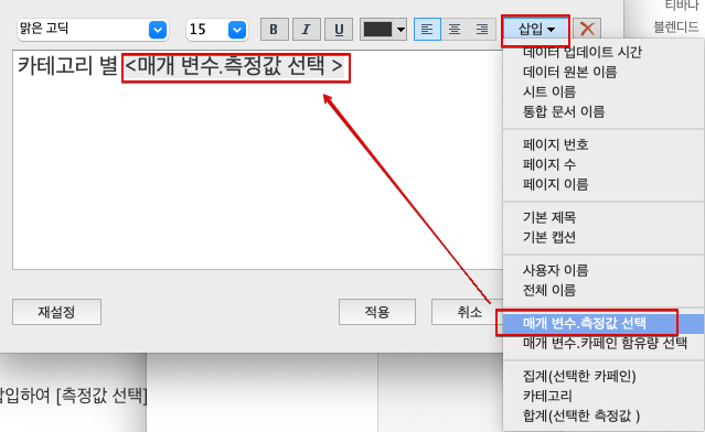 매개변수를 표시 후, 카테고리별(열) 선택한 측정값(행) 배치