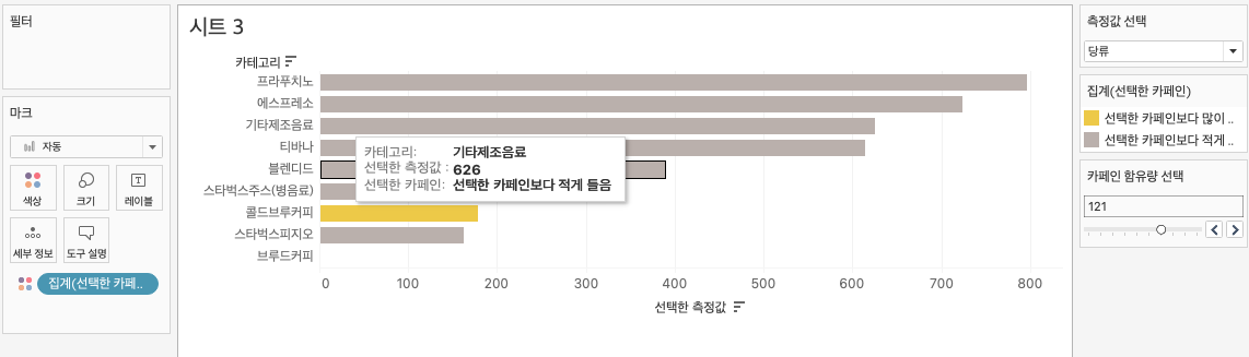 - 값 목록: 카페인, 칼로리, 나트륨, 당류