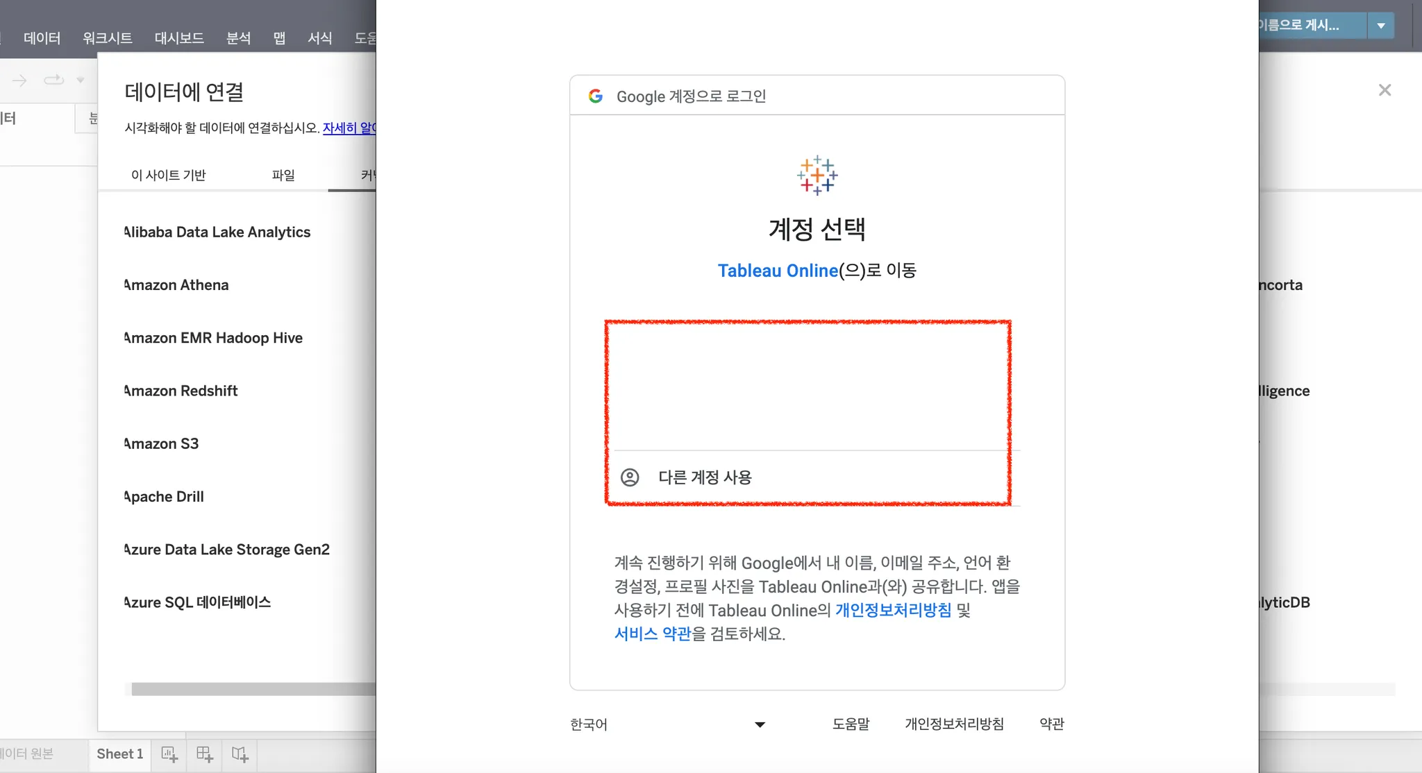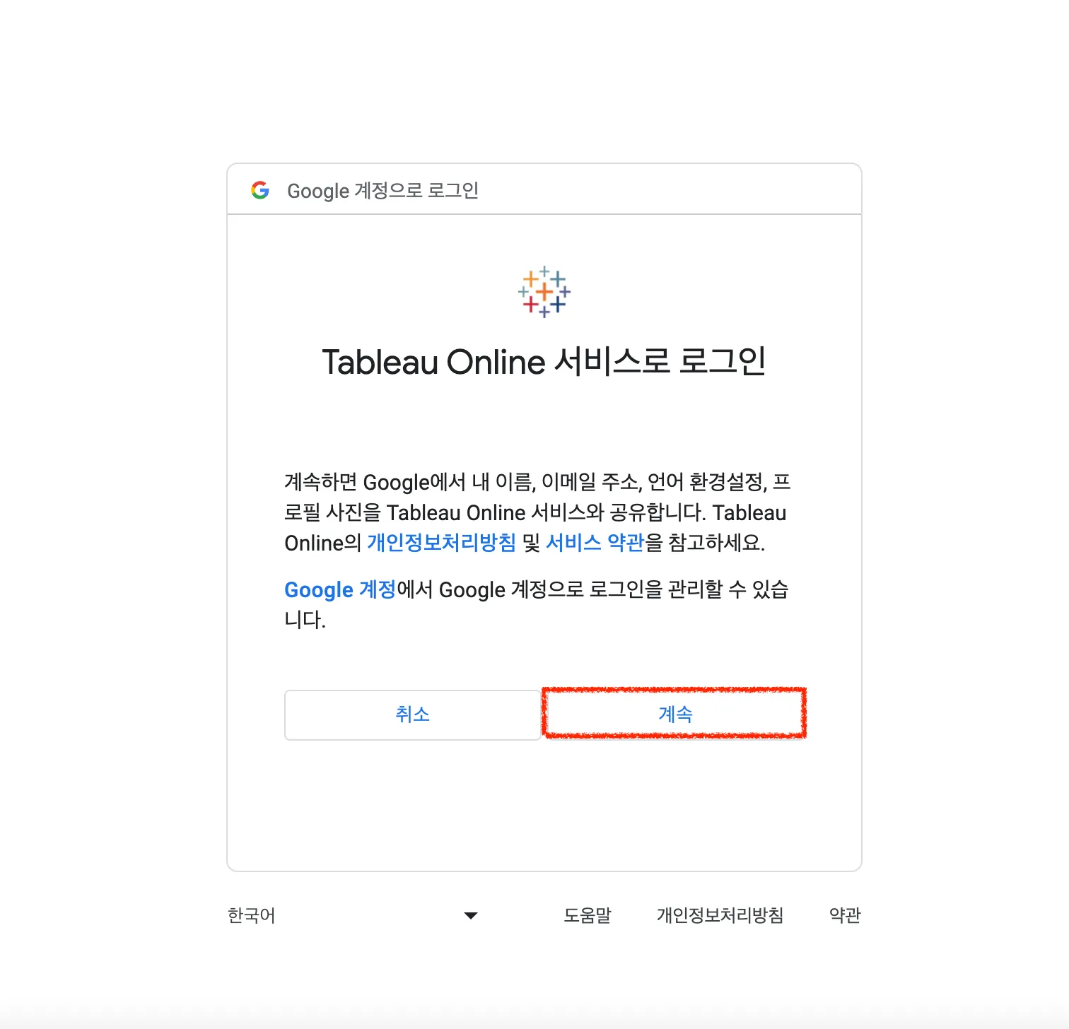 Tableau Online 서비스로 로그인 창이 나오면 하단에 계속 버튼을 클릭