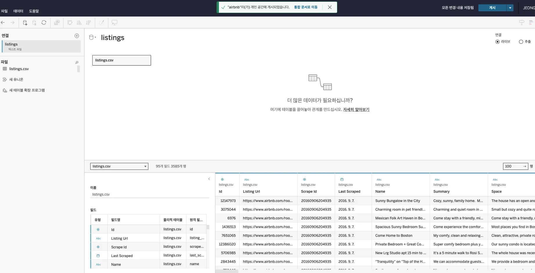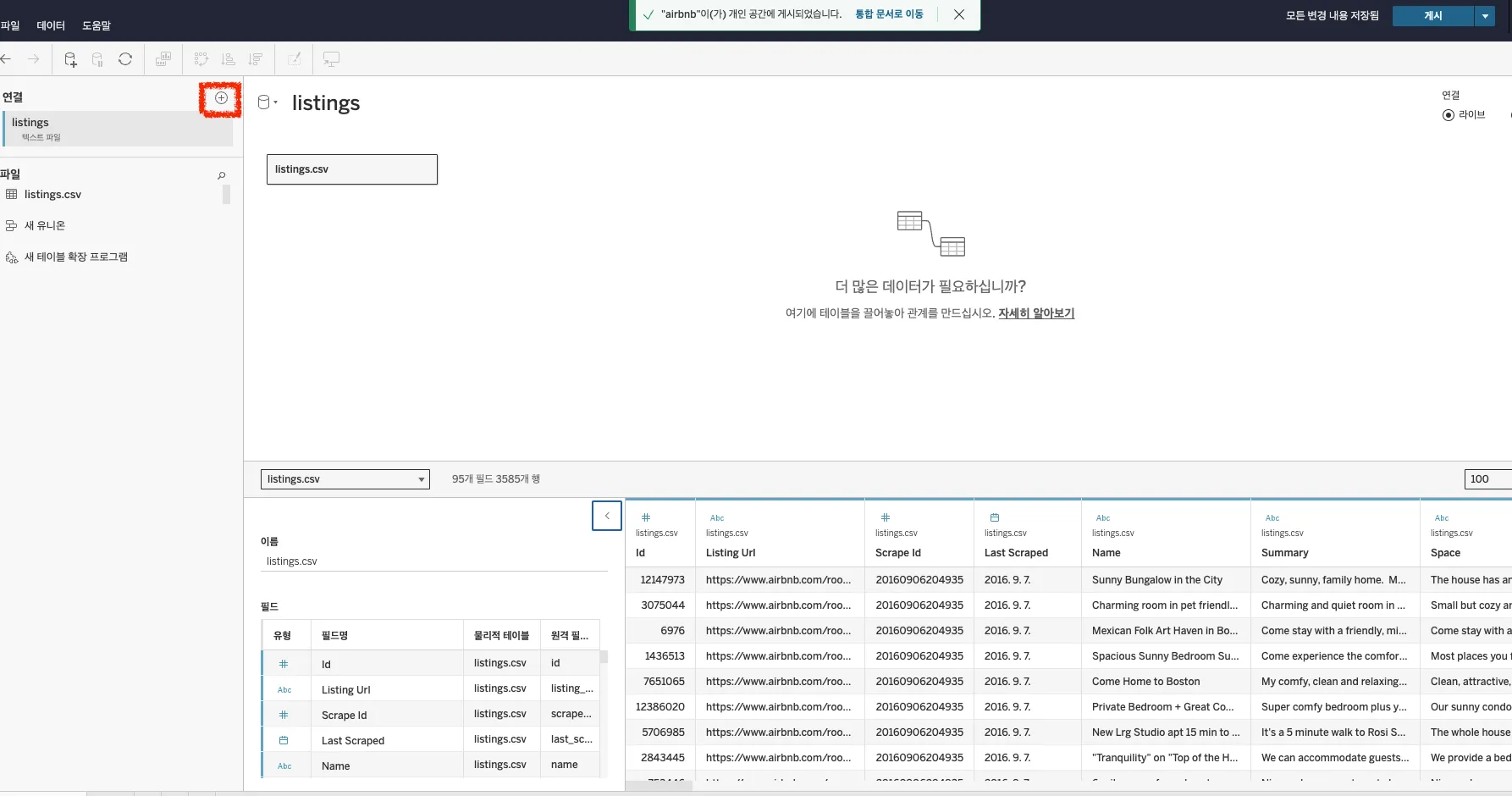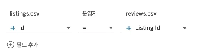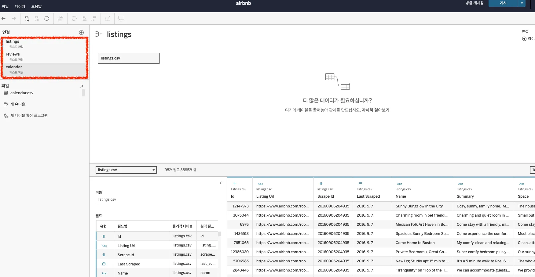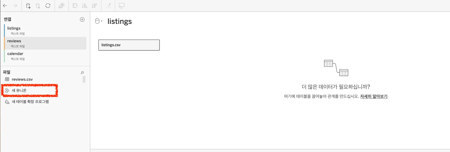 데이터 연결하기(데이터 원본>연결 옆 + 누르기)에서 calendar.csv와 reviews.csv를 위 1-6번 순서대로 반복해서 업로드